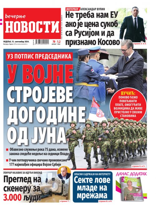 Večernje novosti - Naslovna strana - Štampano izdanje za 15.09.2024.
