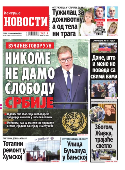 Večernje novosti - Naslovna strana - Štampano izdanje za 25.09.2024.
