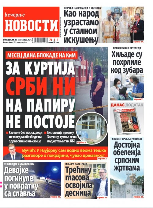Večernje novosti - Naslovna strana - Štampano izdanje za 30.09.2024.
