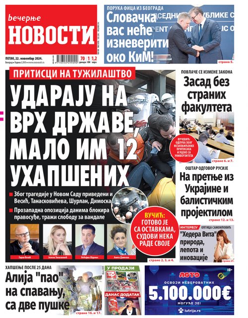 Večernje novosti - Naslovna strana - Štampano izdanje za 22.11.2024.