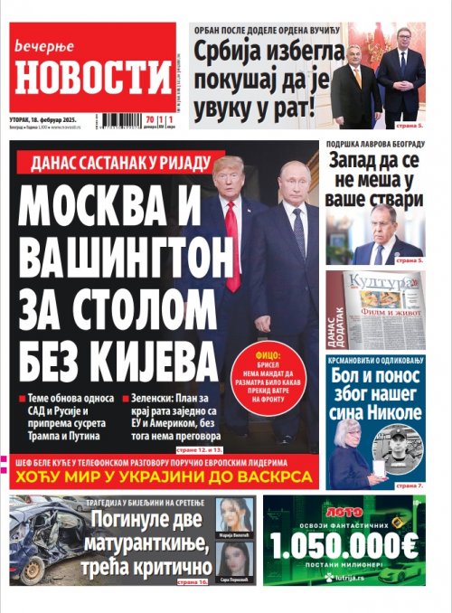 Večernje novosti - Naslovna strana - Štampano izdanje za 18.02.2025.