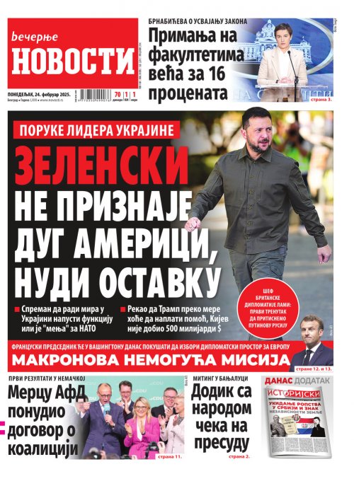 Večernje novosti - Naslovna strana - Štampano izdanje za 24.02.2025.