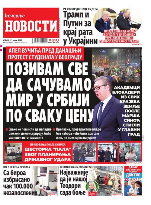 Večernje novosti - Naslovna strana - Štampano izdanje za 15.03.2025.