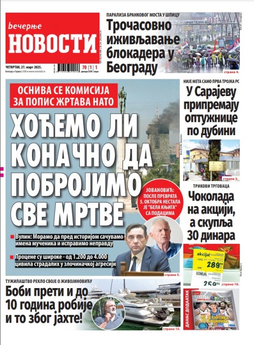 Večernje novosti - Naslovna strana - Štampano izdanje za 27.03.2025.