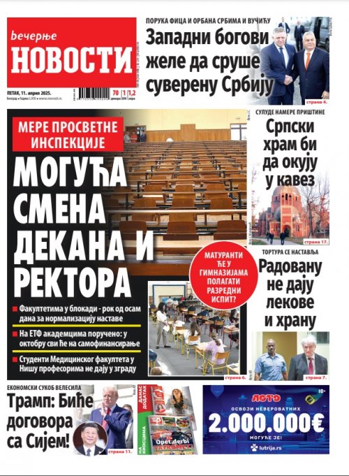 Večernje novosti - Naslovna strana - Štampano izdanje za 11.04.2025.