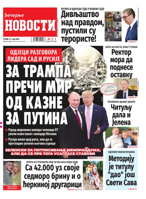 Večernje novosti - Naslovna strana - Štampano izdanje za 21.05.2025.