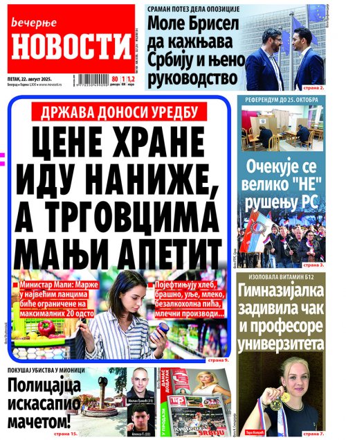 Večernje novosti - Naslovna strana - Štampano izdanje za 22.08.2025.
