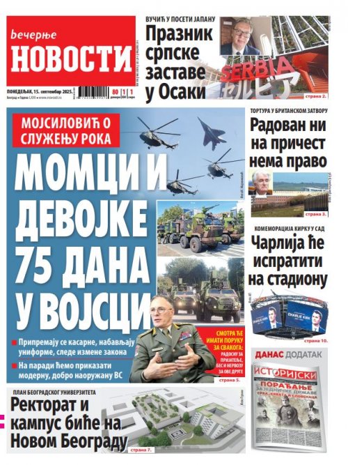 Večernje novosti - Naslovna strana - Štampano izdanje za 15.09.2025.