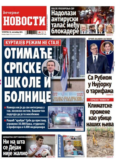 Večernje novosti - Naslovna strana - Štampano izdanje za 18.09.2025.