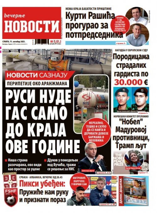 Večernje novosti - Naslovna strana - Štampano izdanje za 11.10.2025.