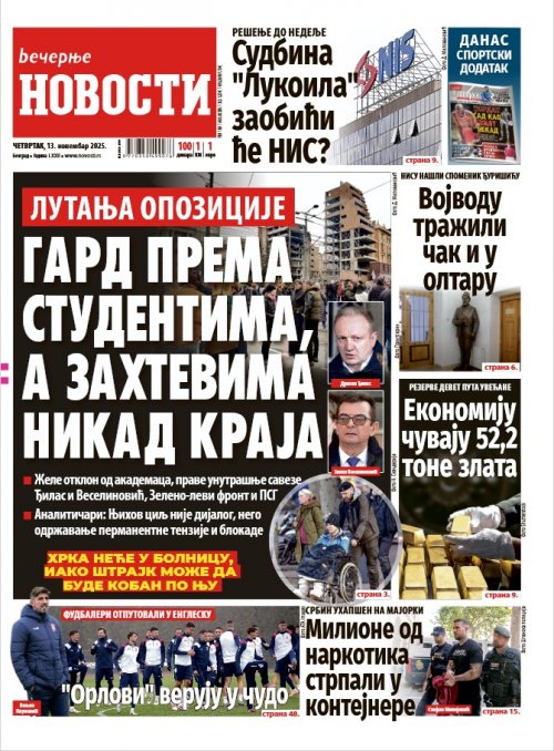 Večernje novosti - Naslovna strana - Štampano izdanje za 13.11.2025.