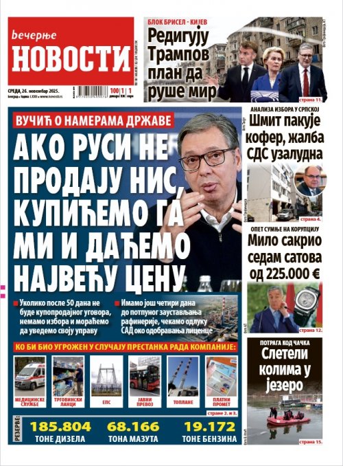 Večernje novosti - Naslovna strana - Štampano izdanje za 26.11.2025.