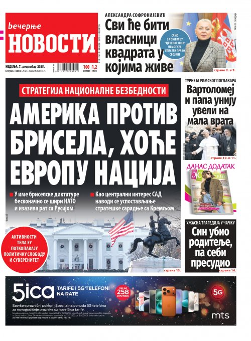 Večernje novosti - Naslovna strana - Štampano izdanje za 07.12.2025.