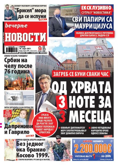 Večernje novosti - Naslovna strana - Štampano izdanje za 16.03.2021.