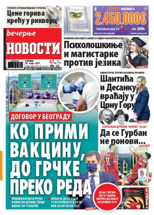 Večernje novosti - Naslovna strana - Štampano izdanje za 30.03.2021.