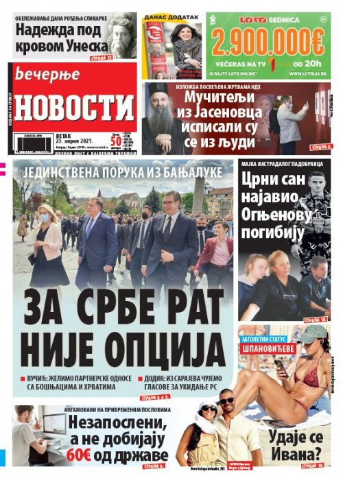 Večernje novosti - Naslovna strana - Štampano izdanje za 23.04.2021.