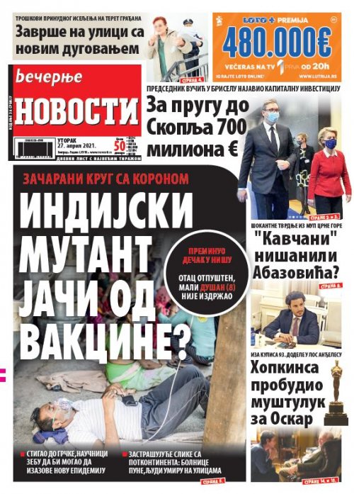 Večernje novosti - Naslovna strana - Štampano izdanje za 27.04.2021.