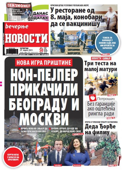 Večernje novosti - Naslovna strana - Štampano izdanje za 29.04.2021.