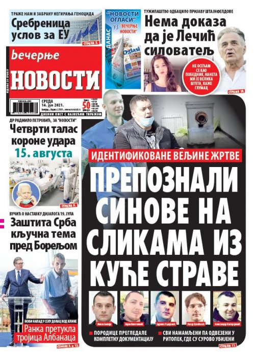 Večernje novosti - Naslovna strana - Štampano izdanje za 14.07.2021.