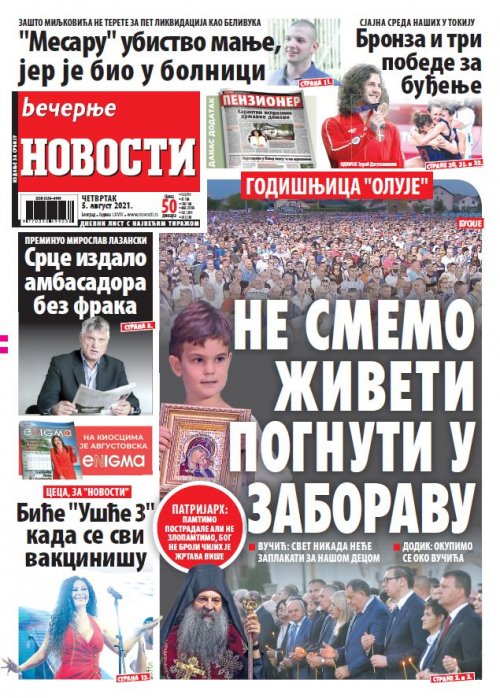 Večernje novosti - Naslovna strana - Štampano izdanje za 05.08.2021.