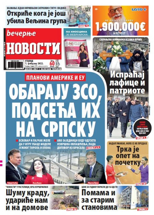 Večernje novosti - Naslovna strana - Štampano izdanje za 01.02.2022.