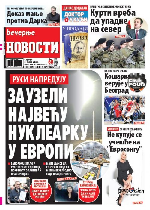 Večernje novosti - Naslovna strana - Štampano izdanje za 05.03.2022.