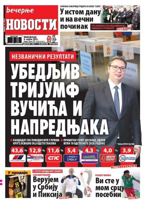 Večernje novosti - Naslovna strana - Štampano izdanje za 04.04.2022.