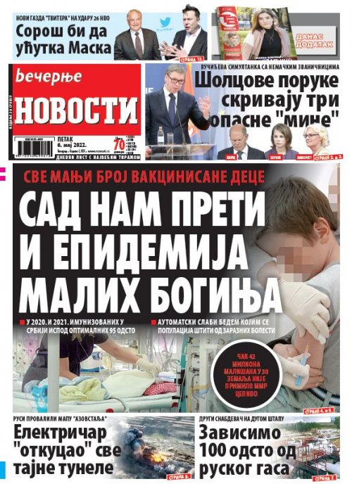 Večernje novosti - Naslovna strana - Štampano izdanje za 06.05.2022.