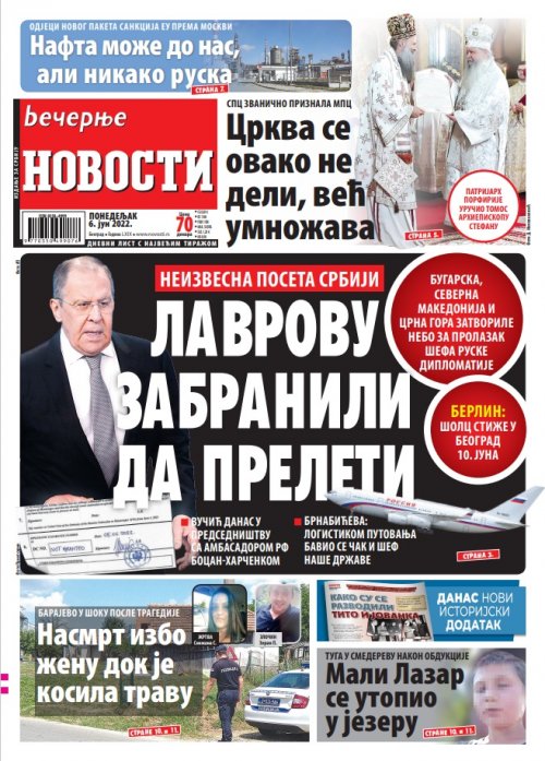 Večernje novosti - Naslovna strana - Štampano izdanje za 06.06.2022.