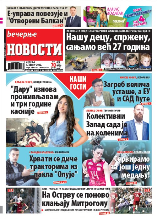 Večernje novosti - Naslovna strana - Štampano izdanje za 07.08.2022.