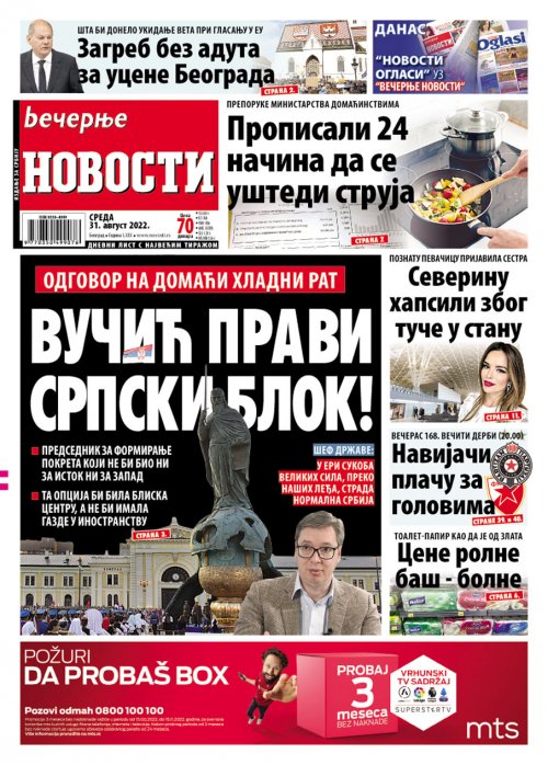 Večernje novosti - Naslovna strana - Štampano izdanje za 31.08.2022.