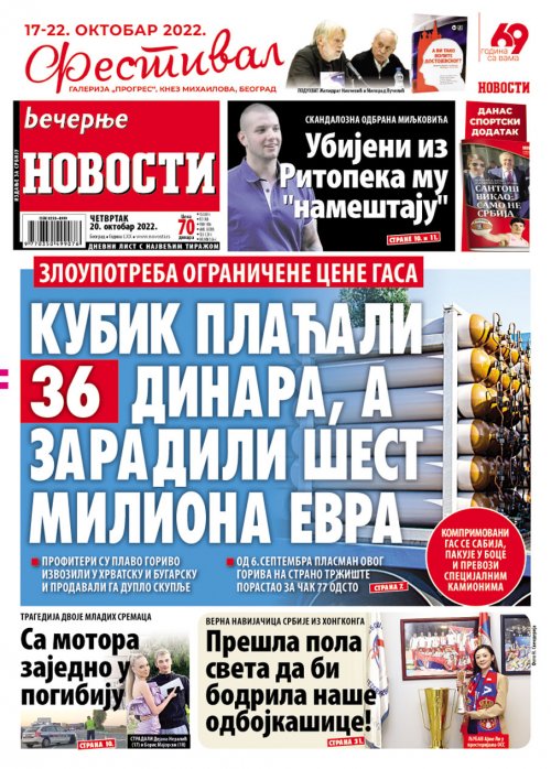 Večernje novosti - Naslovna strana - Štampano izdanje za 20.10.2022.