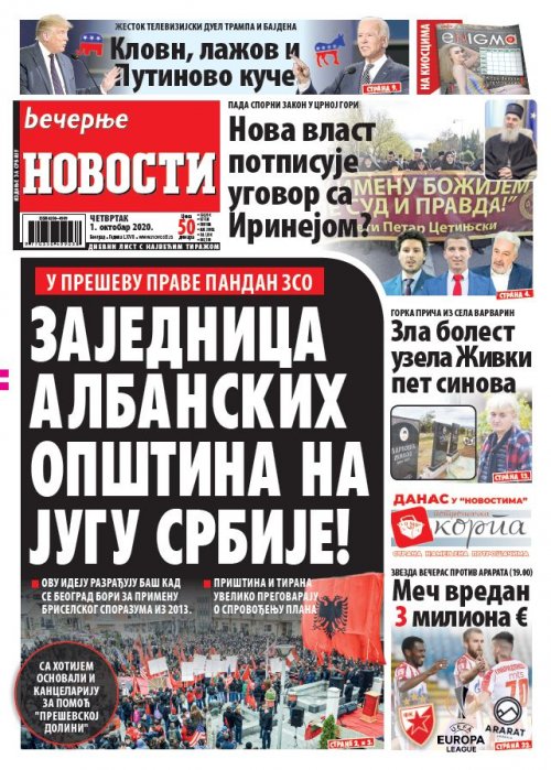 Večernje novosti - Naslovna strana - Štampano izdanje za 01.10.2020.