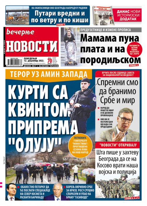 Večernje novosti - Naslovna strana - Štampano izdanje za 12.12.2022.
