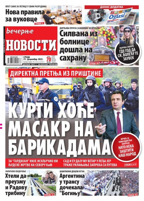Večernje novosti - Naslovna strana - Štampano izdanje za 21.12.2022.