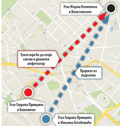 REALIZACIJOM projekta "Beograd na vodi" oživljava se skoro sedam decenija stara ideja o tunelu koji bi išao od Kameničke do Francuske ulice, odnosno od prostora na kojem se danas nalazi Ekonomski fakultet, u neposrednoj blizini Glavne autobuske stanice, pa sve do Dorćola.