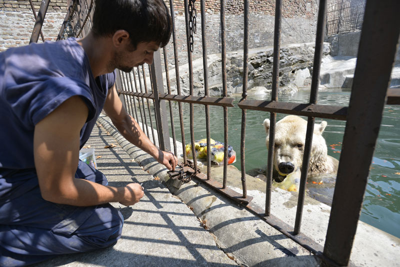 Iako zbog velikih vrućina vreme uglavnom provodi u svojoj pećini, polarni meda Cezar, star 32 godine, odlučio je da prepliva bazen kako bi degustirao zaleđeni "voći kup" koji je pripremljen i na zidiću kaveza serviran specijalno za njega.