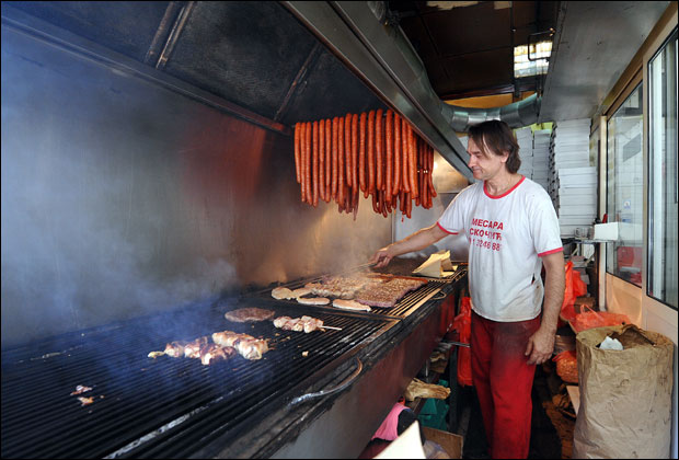 - Teško je, ali navikne se čovek na sve - kaže nam Nebojša Sremac, roštilj-majstor, iz kisoka brze hrane "Skočko", u Dušanovoj ulici. - Najgore je kada se raspaljuje vatra da bi se založio roštilj, ali sve se istrpi. Platu moram da zaradim i na plus 40 i na minus 20.