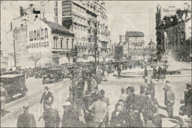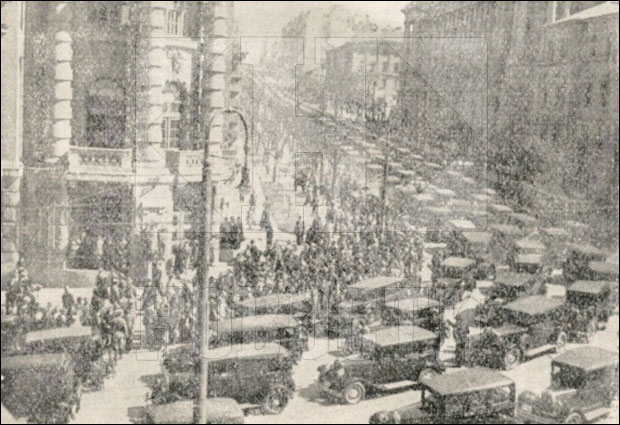 Prvo izdvaja snimak u kojem se Terazijama kreće velika povorka auto-taksija prilikom "manifestacije posvećene ministru finansija zbog smanjenja taksa". Autor skreće pažnju da ovaj kadar nije dobar jer je snimak napravljen sa zemlje i tako nije postignut željeni efekat. Ali, odmah zatim izdvaja primer kako je trebalo ispratiti događaj, kada prikazuje snimak sačinjen iz visine, "u dekoru velikih građevina".