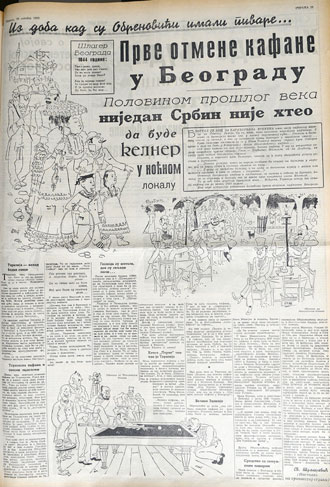 - Otvaranje prvih triju otmenih javnih lokala uzdrmala je u samom početku takozvana kelnerska kriza. U to vreme Srbin i Srbijanac nije nikako hteo da ide u kelnere i da služi kafanske goste. Druga je to služba, kada kršan momak, inače siromah, pogodi kod nekog domaćina, pa ga služi, bilo u varoši, bilo u selu... Služeći ga upoznaje se i sa domaćinom i sa njegovom porodicom, te tako cela služba nimalo ne ponižava jer je srodnička i bratska...