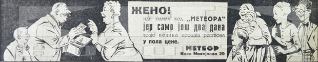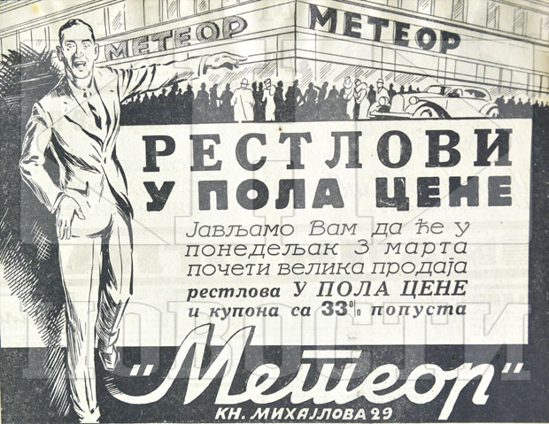 Takođe u Ulici kneza Mihaila, ovog puta na broju 29, bila je trgovina "Meteor", koja je zakupila po pola strane u svim uglednim dnevnim listovima kako bi najavila veliku rasprodaju restlova upola cene. U šarmantnoj onovremenoj reklami, novine upozoravaju da rasprodaja neće još dugo trajati, kroz reči proćelavog domaćina koji gura novac u ruke supruzi uz reči: "Ženo, idi odmah kod 'Meteora', jer još samo dva dana traje rasprodaja..."