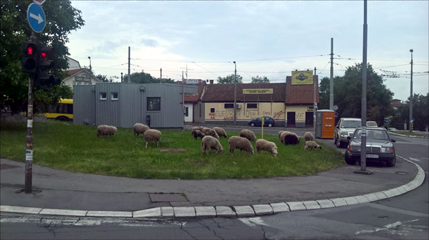 Ipak ima nečega dobrog u "izlasku ovaca na pašu". "Pokosile" su travu na trgu, koju verovatno niko do zime ne bi kosio! Ovako- seoska idila usred Beograda koja sigurno odgovara dobrom delu BG stanovništva za koje znamo odakle potiču.