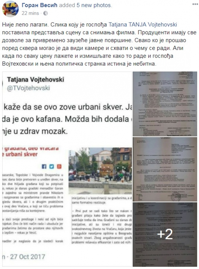 - Nije lepo lagati. Slika koju je gospođa Tatjana TANjA Vojtehovski postavila predstavlja scenu sa snimanja filma. Producenti imaju sve dozvole za privremeno zauzeće javne površine. Svako ko je prošao pored skvera mogao je da vidi kamere i shvati o čemu se radi. Ali kada po svaku cenu lažete i izmišljate kako to rade i gospođa Vojtehovski i njena politička stranka istina je nebitna - napisao je Vesić i priložio dokumente iz kojih se vidi da je ekipa filma imala sve dozvole za snimanje.