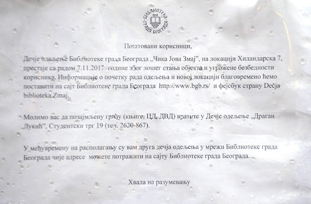Prema rečima Jasmine Ninkov, direktorke Biblioteke grada Beograda, lokal u Hilandarskoj u kojoj je bila smeštena biblioteka "Čika Jova Zmaj" godinama je bio u lošem stanju. Zbog obrušavanja delova fasade morao je da bude zatvoren.