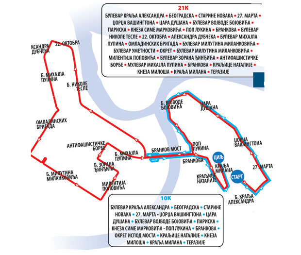 Odatle će takmičari trčati do Beogradske, kroz Starine Novaka, a trasa za obe distance nastavlja se ulicama 27. marta, Džordža Vašingtona, Cara Dušana, Bulevarom vojvode Bojovića, Pariskom, Kneza Sime Markovića, Pop Lukinom i Brankovom, gde se "polumaratonci" razdvajaju od trkača na 10 kilometara.