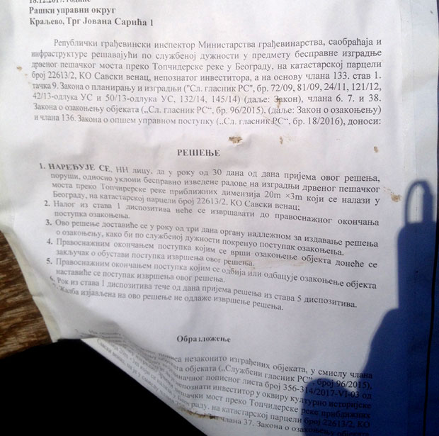S obzirom na to da investitor, po svemu sudeći, nije poznat, na drvenoj konstrukciji osvanulo je rešenje kojim se N. N. licu nalaže da u roku od mesec dana od prijema poruši most. Ali male su šanse da se za most, koji je tu decenijama, jave odgovorni.