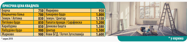 Jednosobni stanovi od prosečno 40 kvadrata, koji ne zahtevaju dodatno ulaganje, kao što je renoviranje stolarije i opremanje kupatila, prodaju se na Čukarici, delovima Novog Beograda, Zemuna i Palilule. Novogradnja i centralno grejanje su stavke koje povećavaju cenu kvadrata na svakom od ovih odredišta. Ukoliko se kupac ipak odluči za dvosobni, porodični stan, čija kvadratura iznosi oko 50 ili 60 metara kvadratnih, može da računa na kvadrate po nešto nižoj ceni. Međutim, to neretko podrazumeva dodatno ulaganje i renoviranje prostora, što kao krajnji rezultat često ima troškove koji su mnogo veći od prvobitno planiranih.