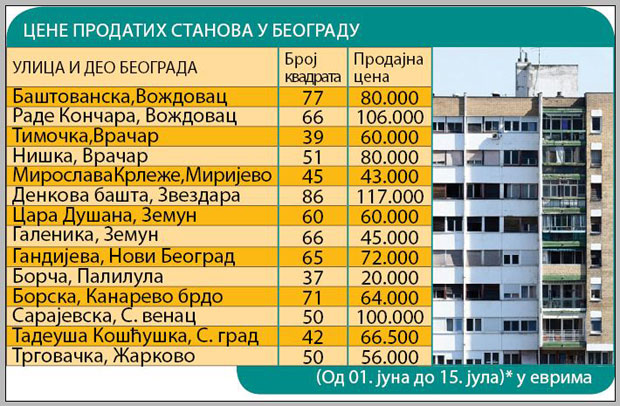 Prema podacima Javnog uvida u registar cena nepokretnosti, na Novom Beogradu od 1. juna, pa do danas prodato je 117 stanova. Najjeftinije su plaćena dva stana veličine 65 kvadrata u Ulici dr Ivana Ribara. Cena kvadrata ove starogradnje bila je oko 1.000 evra. U ostalim delovima najmnogoljudnije beogradske opštine, raspon cena stare gradnje se kreće od 1.200 do 1.500 evra, u zavisnosti od lokacije. Najslabije po vrednosti se kotiraju stanovi oko "Kineza" i Starog Merkatora. Najbolju cenu postigao je prodavac stana od 54 kvadrata u Bulevaru Zorana Đinđića. Svoju nekretninu je prodao za 92.000 evra. U Belvilu je krajem prošlog meseca prodat stan od 51 kvadrat sa garažnim mestom za 82.000 evra. Najbolje prodata novobeogradska garsonjera se nalazi na Bežanijskoj kosi. Za 34 kvadrata, novi vlasnik je izdvojio čak 60.000 evra.