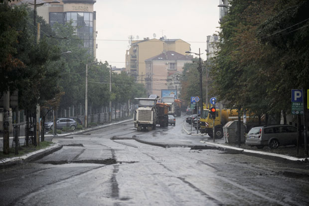 Vozila JP "Beograd put" zauzela su po planu deo Takovske, od raskrnice sa Ulicom 27. marta do Jaše Prodanovića. Skidanje asfalta delom je bilo gotovo, ali iznenadni pljuskovi zaustavili su putare. Neki su se sklonili u kabine da proćaskaju ili kratko zadremaju, dok su drugi ispod nadstrešnica čekali da kiša stane.