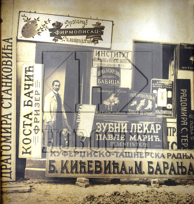 Jedna velika fotografija na zidu restorana motivisala nas je da započnemo ovaj razgovor. Nekada davno firmopisac Dragoljub Dimitrijević priuštio je sebi fotografiju i zadovoljstvo tako što je sa ponosno stajao ispred svoje radnje u nekadašnjem gradu. A tamo... Od natpisa za zvanične, državne institucije, poput Instituta za porađanje i ženske bolesti, preko ponosnog vlasnika "kuferdžisko-tašnerske radnje", do zubnog lekara, ali i "Zavoda za pranje i glačanje beloga rublja".